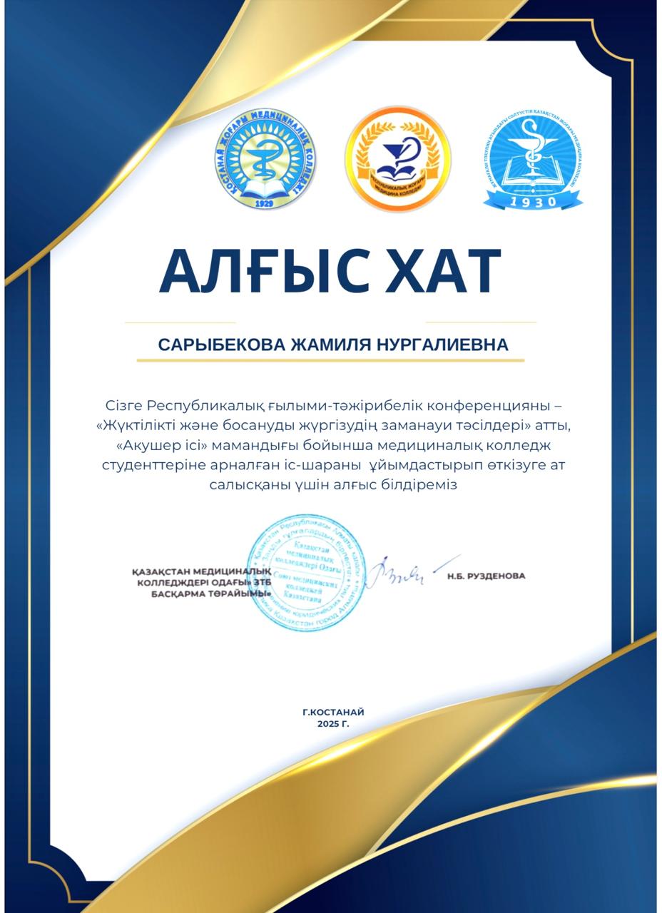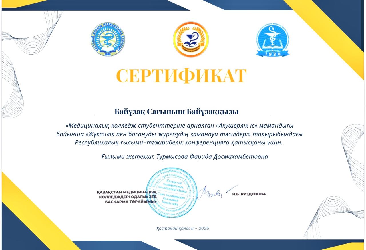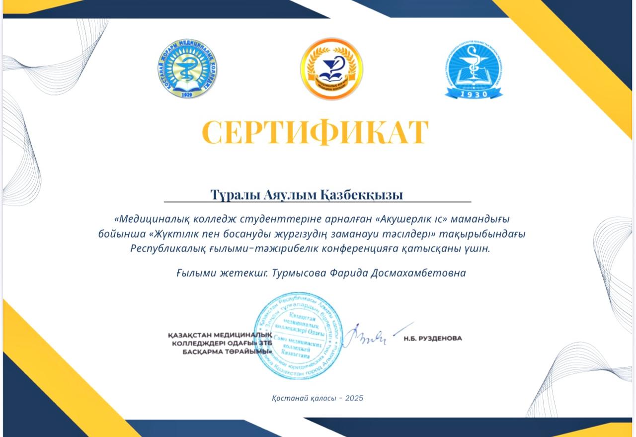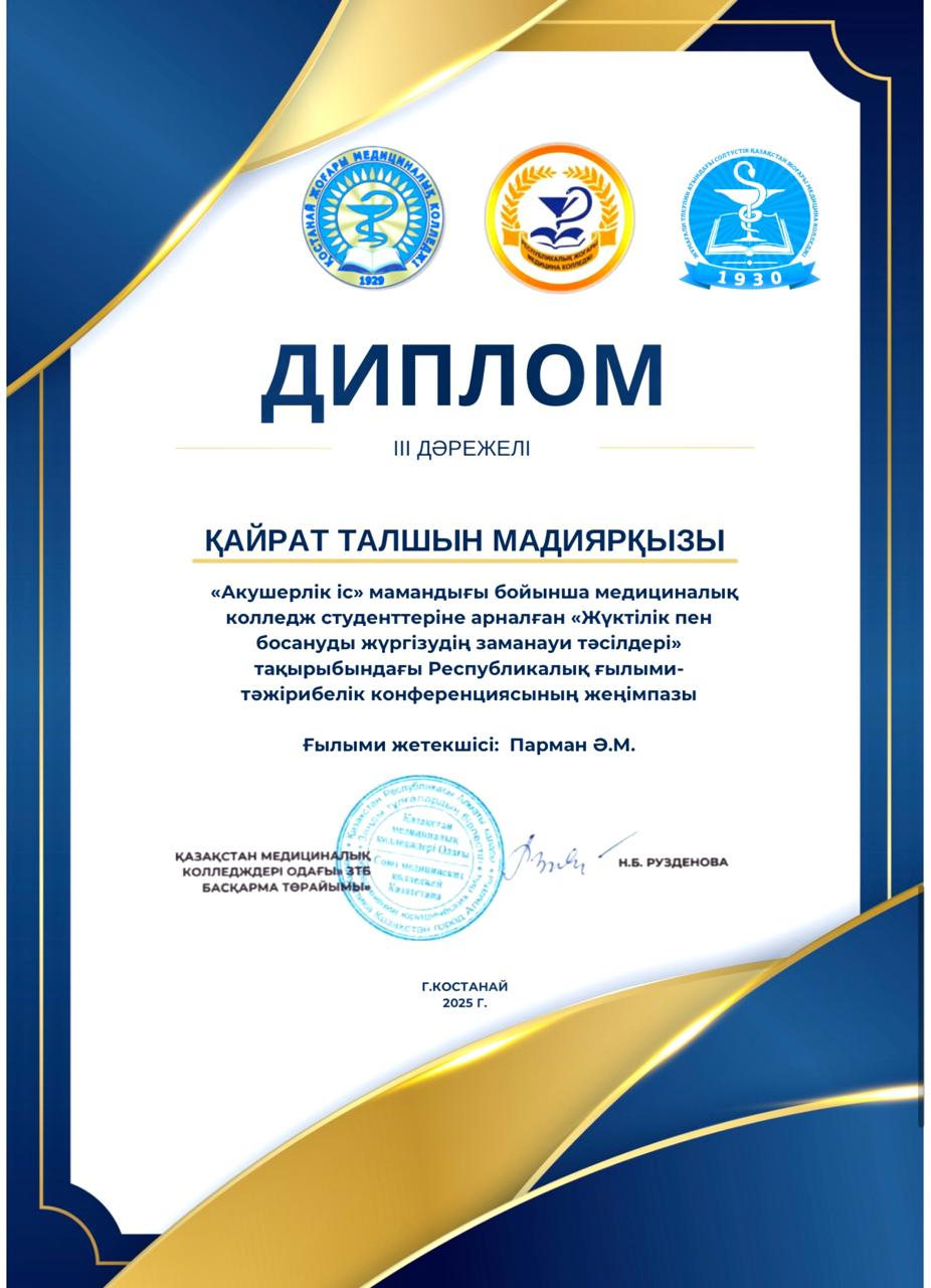 Қостанай жоғары медициналық колледжі ұйымдастыруымен өткен «Акушерлік іс» мамандығы бойынша медициналык колледж студенттеріне арналған «Жүктілік пен босануды жүргізудің заманауи тәсілдері» тақырыбындағы Республикалық ғылыми- тәжірибелік конференциясына 331 топ студенттері Бегимова Ақниет Марсбековна, жетекшісі Махатова А.Б. және Қайрат Талшын, жетекшісі Парман Ә. М., қатысып, жүлделі III орын иеленді, Тұралы Аяулым Қазбекқызы және Байұзақ Сағыныш Байұзаққызы сертификатпен марапатталды, жетекшісі Турмысова Ф.Д.