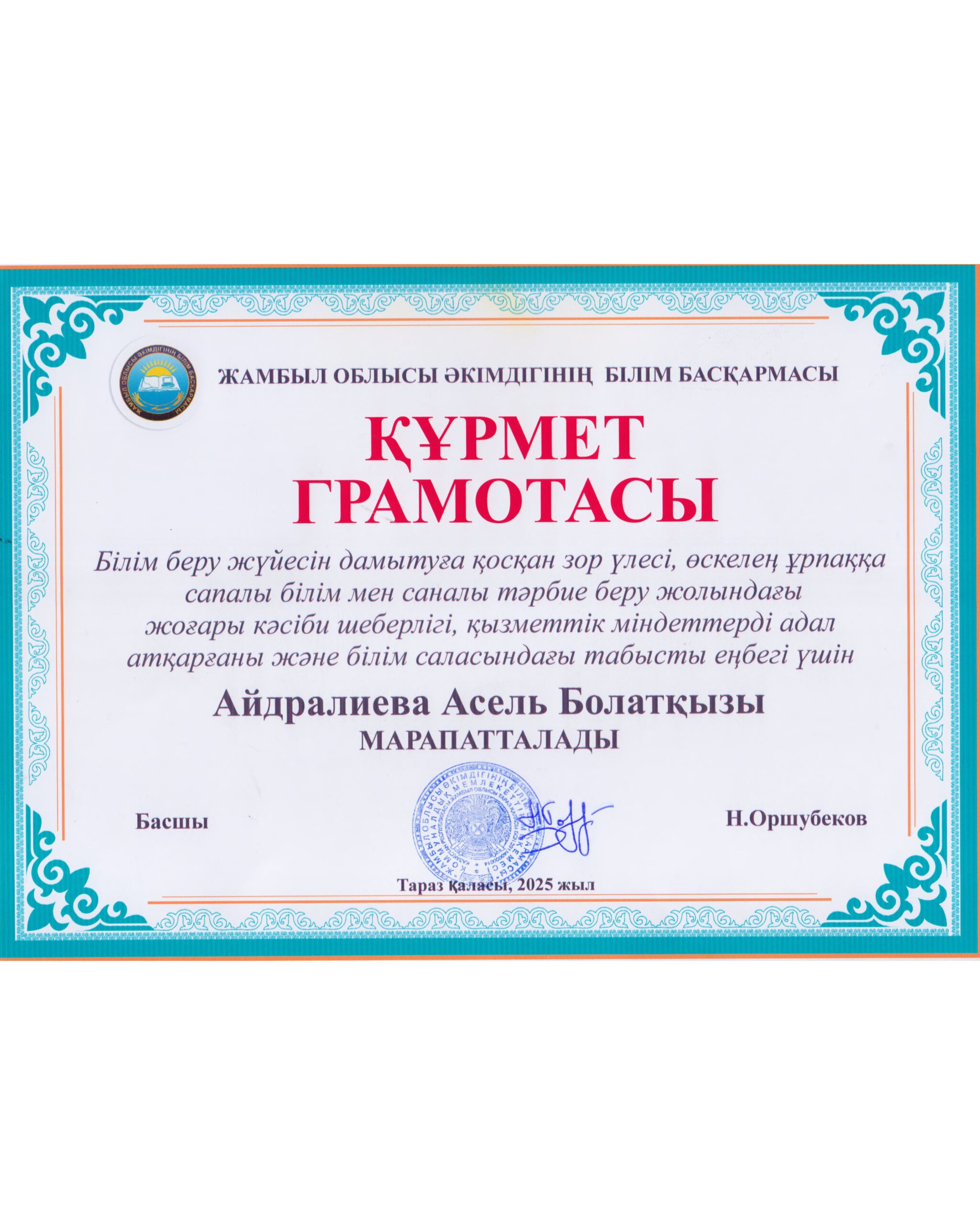 Білім беру жүйесін дамытуға қосқан зор үлесі, өскелең ұрпаққа сапалы білім мен саналы тәрбие беру жолындағы жоғары кәсіби шеберлігі, қызметтік міндеттерді адал атқарғаны және білім саласындағы табысты еңбегі үшін «Мейіргер ісі» бөлім меңгерушісі Айдралиева Асель Болатовна Жамбыл облысы әкімдігінің білім басқармасының Құрмет грамотасымен марапатталды.