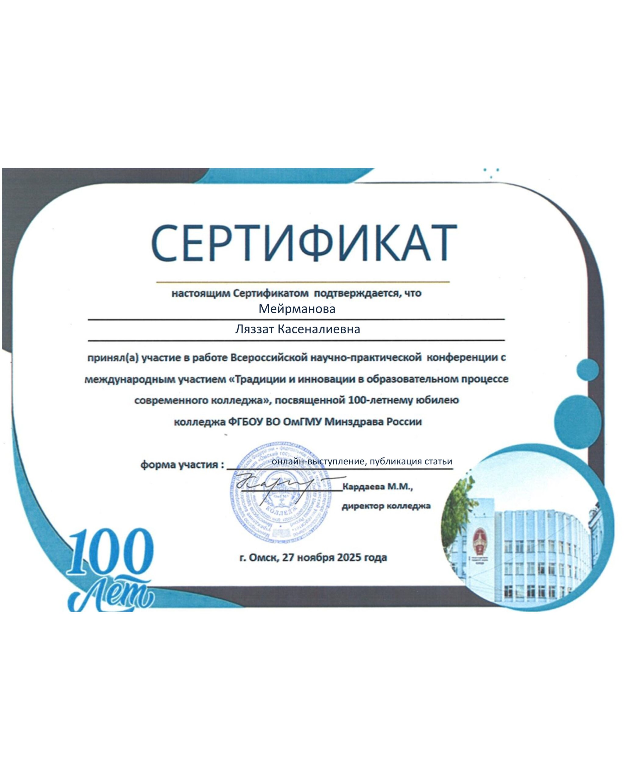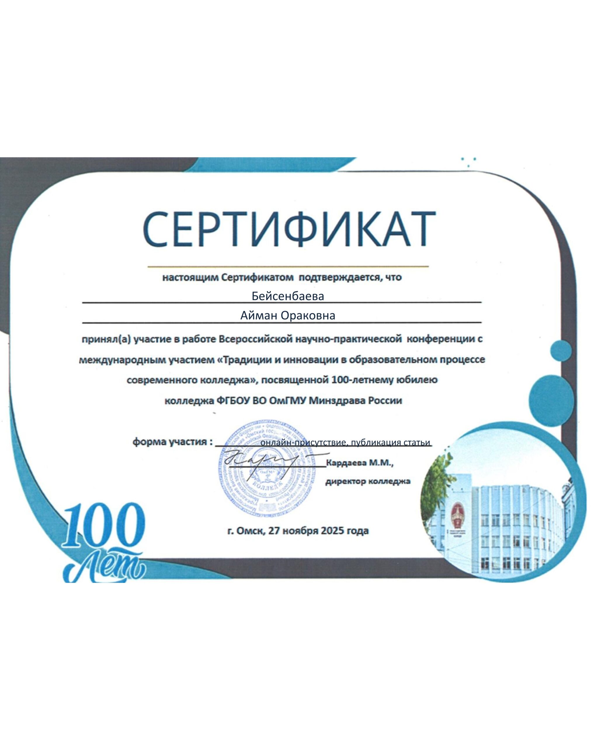Омск медициналық колледжінің 100 жылдығына арналған «Қазіргі заманғы колледждің оқу үдерісіндегі дәстүрлер мен инновациялар» тақырыбында халықаралық қатысуымен өткен ғылыми-практикалық конференциясына колледж директоры Ж.Н.Сарыбековаға, директордың оқу- тәрбие ісі жөніндегі орынбасары Л.Т.Қуанышбековаға, әдістемелік кабинетінің меңгерушісі Л.К.Мейрмановаға, орыс тілі және әдебиет пәнінің оқытушысы А.О. Бейсенбаеваға қатысқандары үшін сертификат берілді.