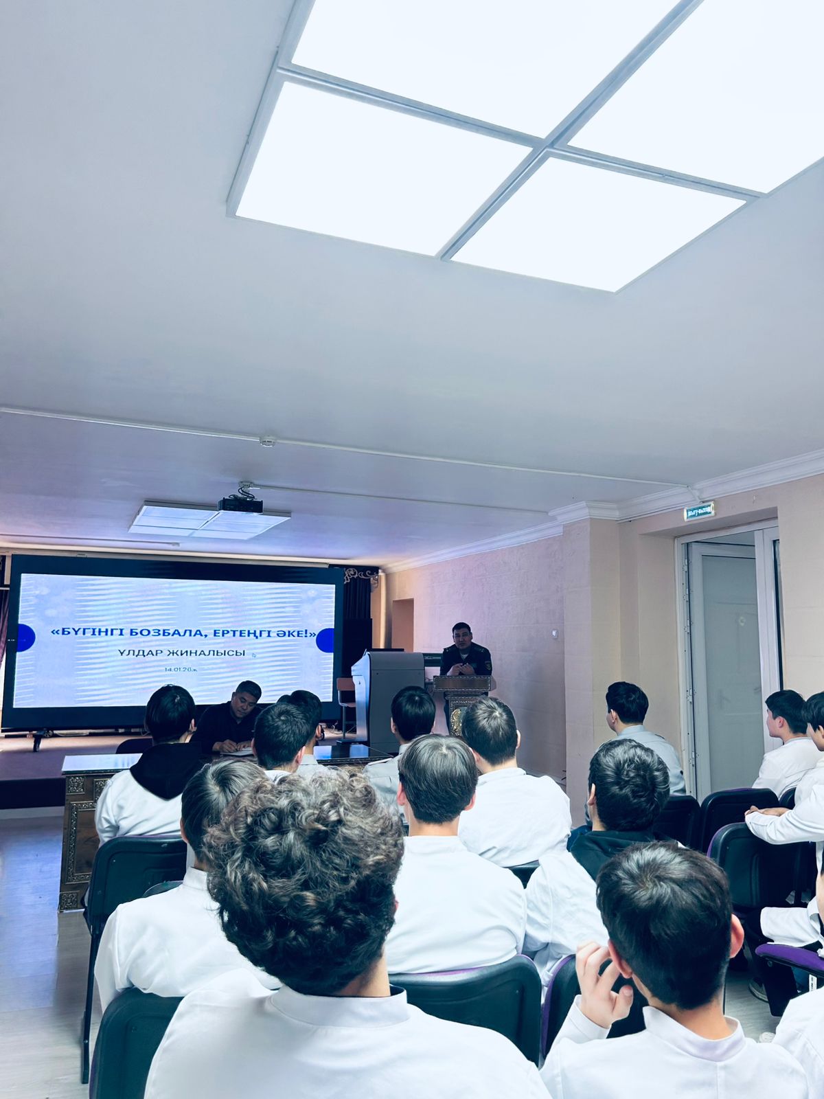 14.01.2026 ж. Тәрбие бөлімінің ұйымдастыруымен құқықтық мәдениетті қалыптастыру және құқық бұзушылықтың алдын алу мақсатында «Бүгінгі бозбала, ертеңгі әке!» тақырыбында ұлдар жиналысы өткізілді.