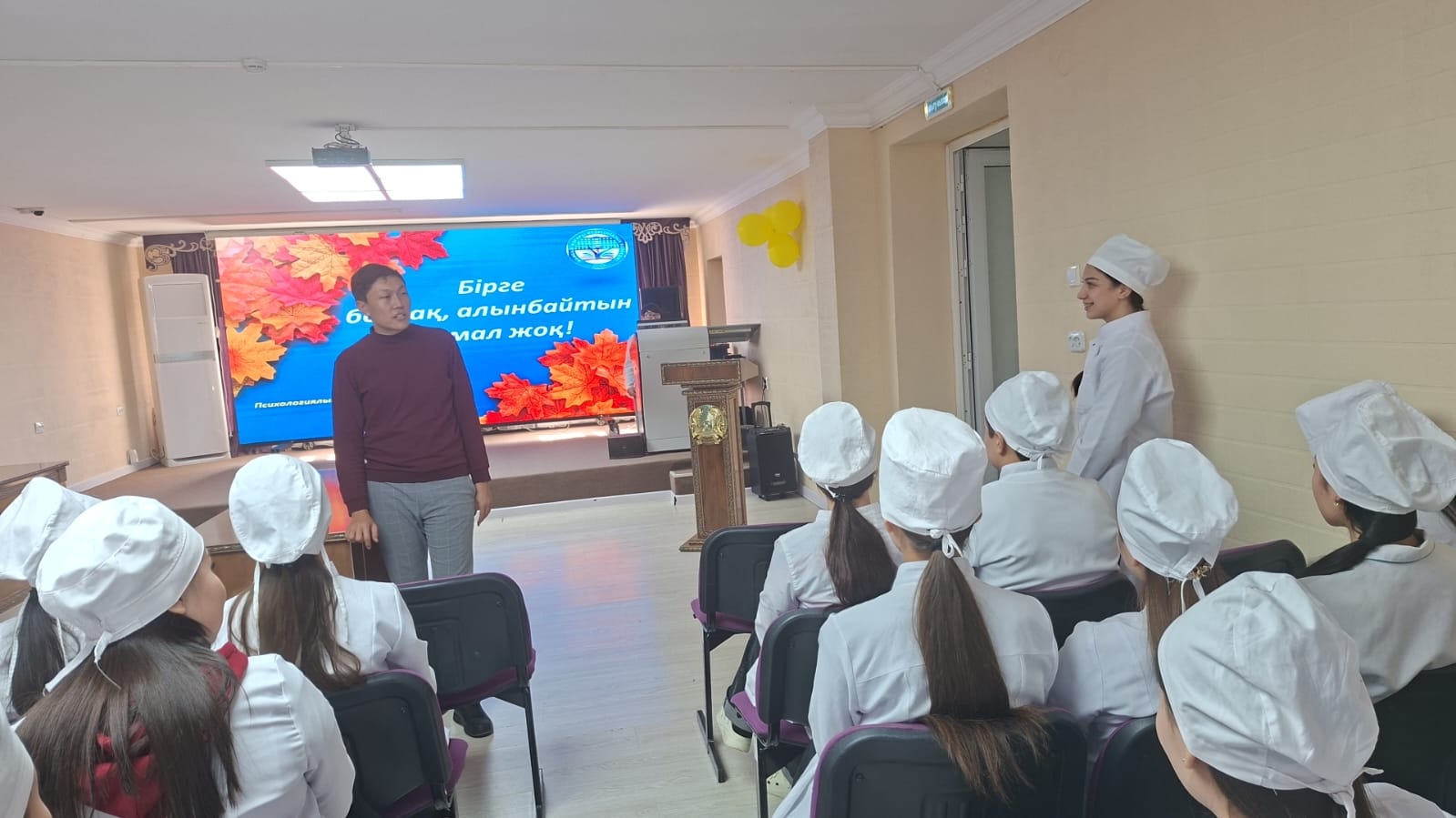 18.09.2025 ж. Жамбыл жоғары медициналық колледждінде топ ішіндегі ынтымақтастықты күшейтуге, бірлік пен өзара қолдаудың маңызын сезінуге арналған психологиялық тренинг өтті. Студенттер ашық әңгімелесу, пікір алмасу және бір-бірін тереңірек тану арқылы командалық рухтың қаншалықты маңызды екенін түсінді. Шара барысында топ мүшелері бір-біріне сенуді, бірге шешім қабылдауды, ортақ мақсатқа жұмылуды тәжірибе түрінде меңгерді. Тренинг студенттердің бойында сенім, жауапкершілік, достық пен қолдау сезімдерін нығайтып, команда болып әрекет етудің қандай күшті екенін айқын көрсетті. Бірлік бар жерде – бәрі мүмкін! Бірге болғанда кез келген қиындықты жеңуге болатынын жастар тағы бір мәрте дәлелдеді.