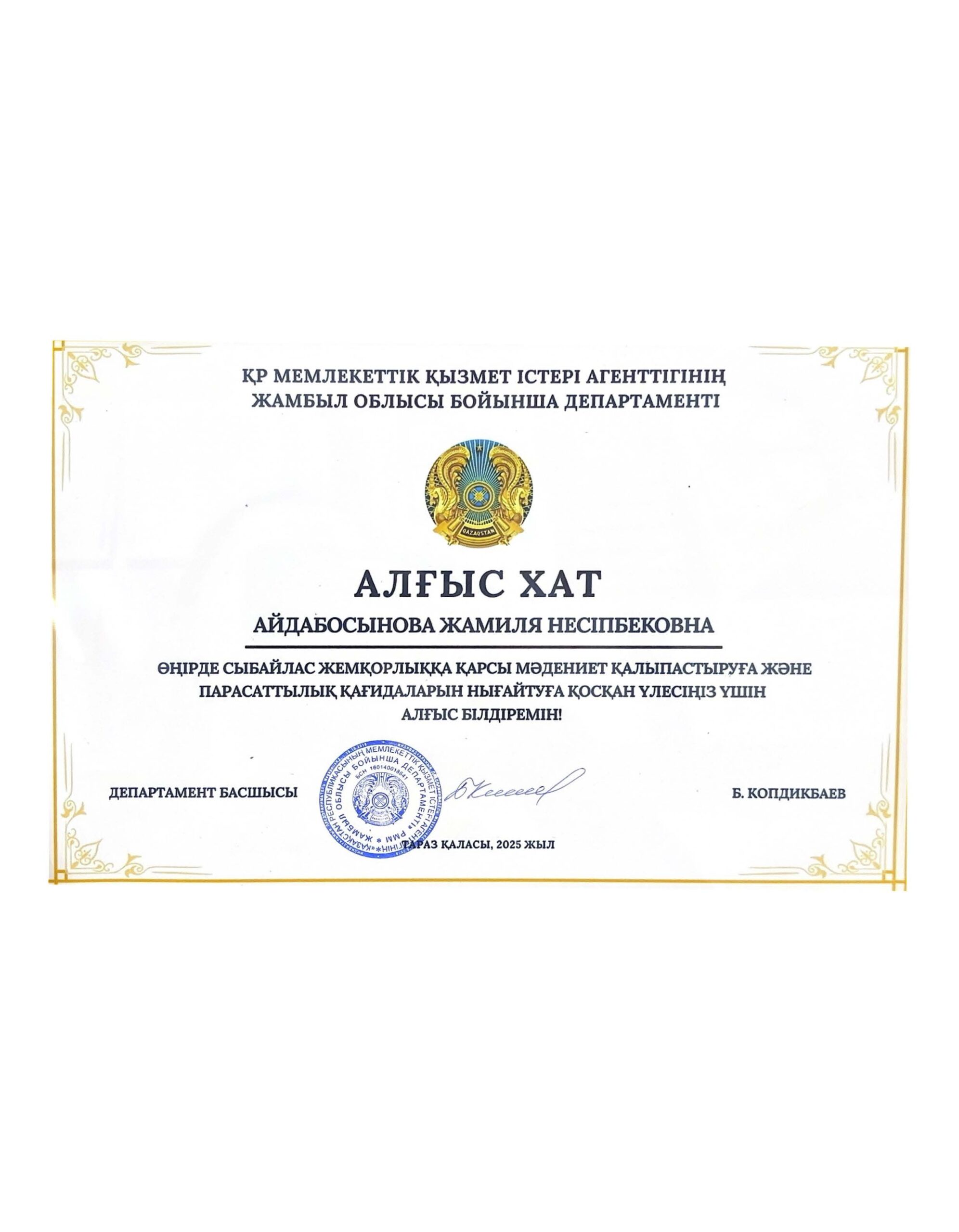 ҚР мемелекеттік қызмет істері агенттігінің Жамбыл облысы бойынша департаментінің Алғыс хаты