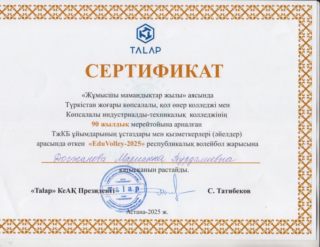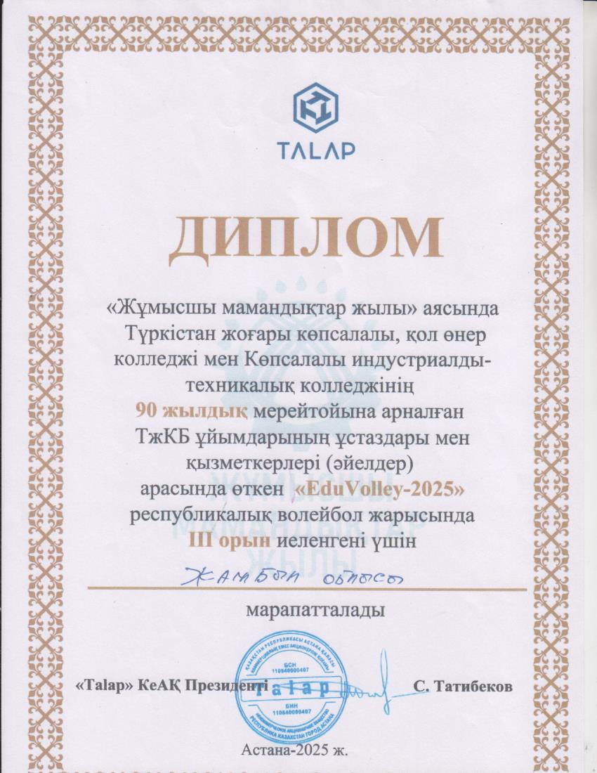 18-20.11.2025 ж. Түркістан қаласында «Жұмысшы мамандықтар жылы» аясында Түркістан жоғары көпсалалы, қол өнер колледжі мен Көпсалалы индустриалды-техникалық колледжінің 90 жылдық мерейтойына арналған ТжКБ ұйымдарының ұстаздары мен қызметкерлері арасында өткен «Edu Volley-2025» республикалық волейбол жарысына Жамбыл облысы командасы қатысып жүлделі III орын иеленді. Команда құрамында Жамбыл жоғары медициналық колледжінің атынан дене шынықтыру пәнінің оқытушысы Досжанова Марианна Турдалиевна қатысып, сертификатпен марапатталды.