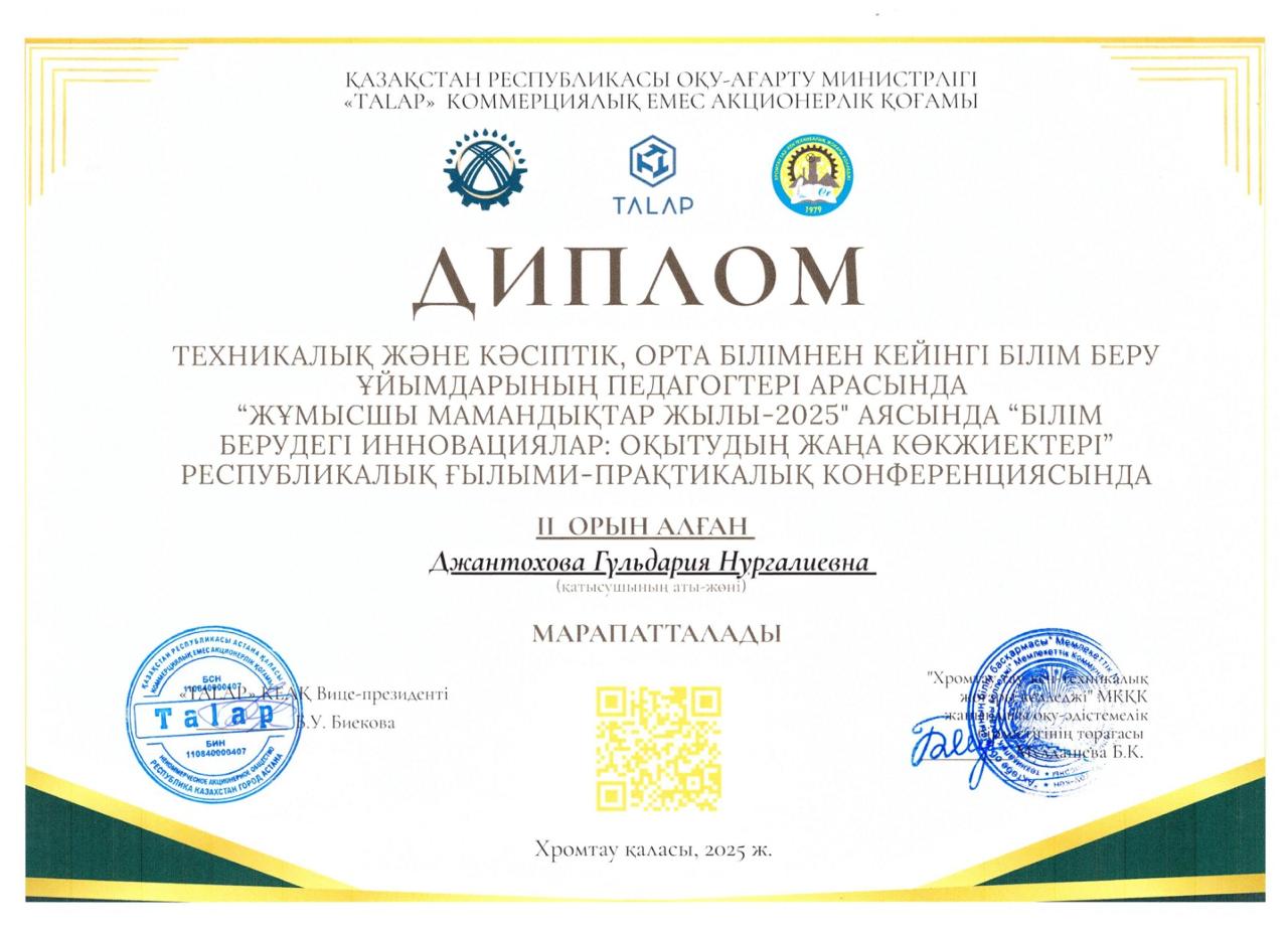 Қазақстан тарихы пәнінің оқытушысы Жантохова Г.Н. «Талап» КЕАҚ және Хромтау тау-кен техникалық жоғары колледжі ұйымдастыруымен өткізілген «Жұмысшы мамандықтар жылы-2025» аясында ...
