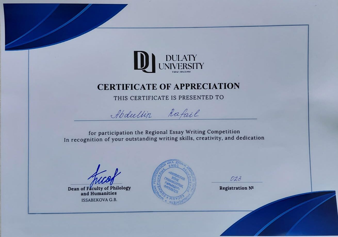31.10.2025 жылы М.Х.Дулати атындағы Тараз университетінің филология және гуманитарлық ғылымдар факультетінің «Әлем тілдері» кафедрасының, «Lingualab» студенттік ғылыми үйірмесінің ұйымдастыруымен өткен Эссе жазу байқауында Жамбыл жоғары медициналық колледжінің 220 ЕФ -9/24 топ студенті Оңалбек Жібек ΙΙΙ орынға ие болғаны үшін және 127 ЛД-11/25 топ студенті Абдуллин Рафаиль мен 201 М-9/24 Надирова Мерей Өңірлік эссе жазу байқауына қатысып, тамаша жазу дағдылары, шығармашылық қабілеттерін танытқаны үшін Сертификатпен марапатталды.