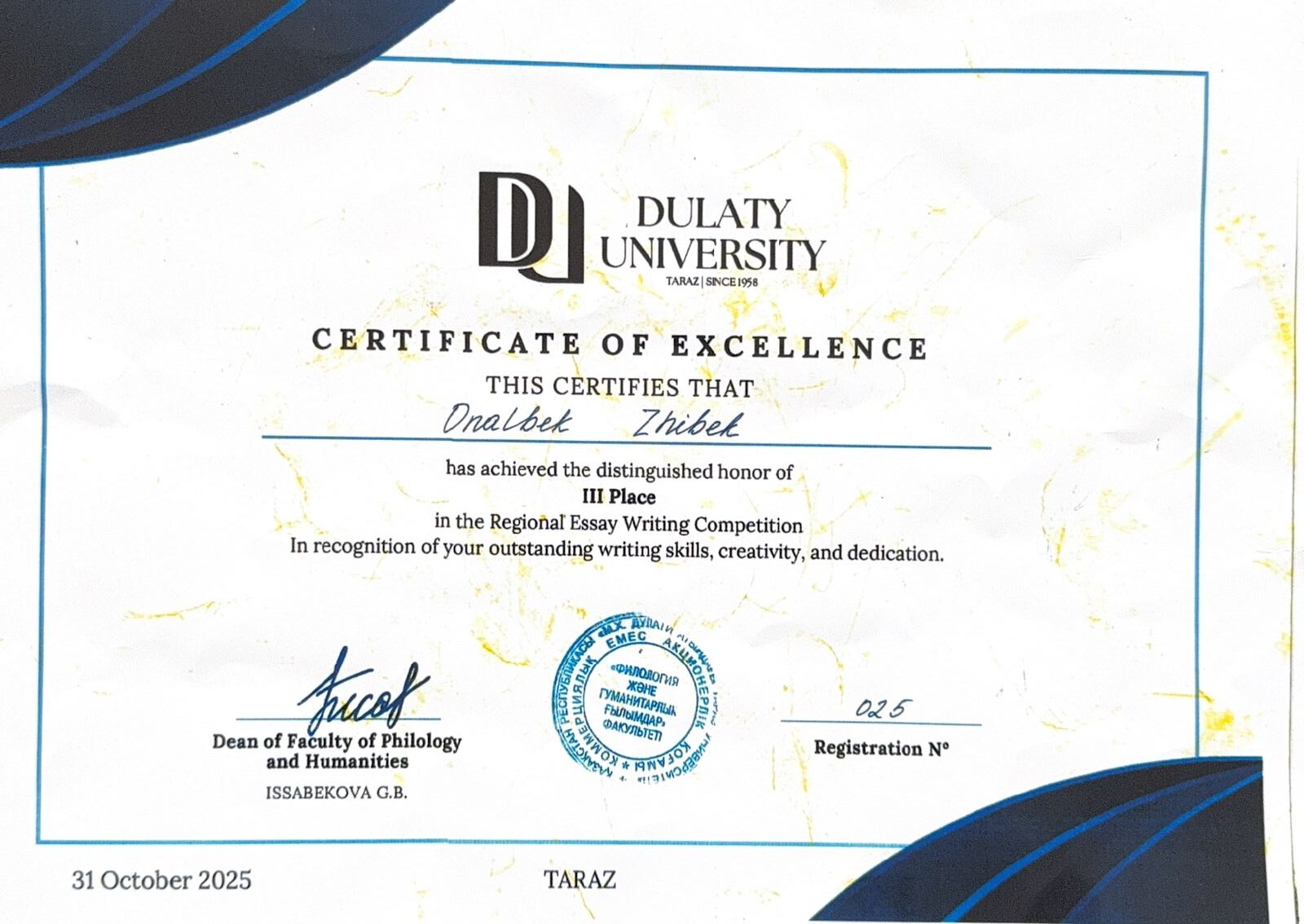 31.10.2025 жылы М.Х.Дулати атындағы Тараз университетінің филология және гуманитарлық ғылымдар факультетінің «Әлем тілдері» кафедрасының, «Lingualab» студенттік ғылыми үйірмесінің ұйымдастыруымен өткен Эссе жазу байқауында Жамбыл жоғары медициналық колледжінің 220 ЕФ -9/24 топ студенті Оңалбек Жібек ΙΙΙ орынға ие болғаны үшін және 127 ЛД-11/25 топ студенті Абдуллин Рафаиль мен 201 М-9/24 Надирова Мерей Өңірлік эссе жазу байқауына қатысып, тамаша жазу дағдылары, шығармашылық қабілеттерін танытқаны үшін Сертификатпен марапатталды.