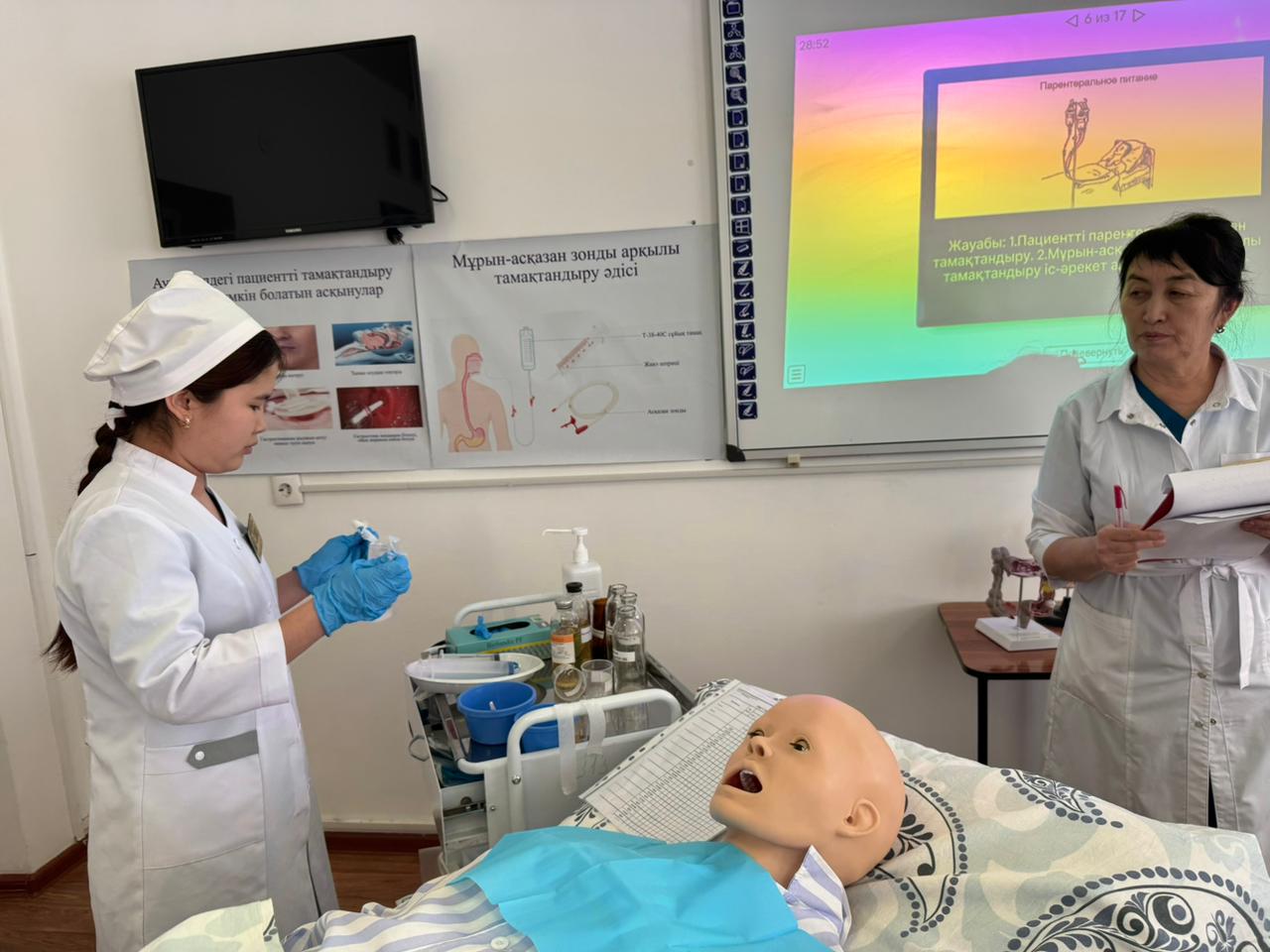 «Медициналық мекемелерде емдік тамақтануды ұйымдастыру. Пациентті тамақтандыру әдістері» тақырыбында ашық симуляциялық сабақ өткізді. Симуляциялық сабақтың мақсаты: студенттерге диета және диетотерапия ұғымдарын, диеталық тағамның құрамын, медициналық мекемелерде емдік тамақтандыруды ұйымдастыру қағидаларын, пациентті тамақтандыру түрлерін түсіндіру. Сабақ барысында халі ауыр пациенттерді табиғи және жасанды жолдармен тамақтандыру әдістері, тамақтандырудың көрсеткіштері мен қарсы көрсеткіштері, сондай-ақ мүмкін болатын асқынулардың алдын алу шаралары қарастырылып, іс-әрекет алгоритмдері көрсетіліп, студенттер тәжірибелік дағдыларды меңгерді.