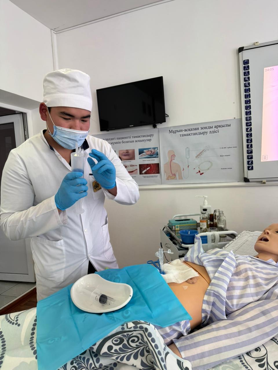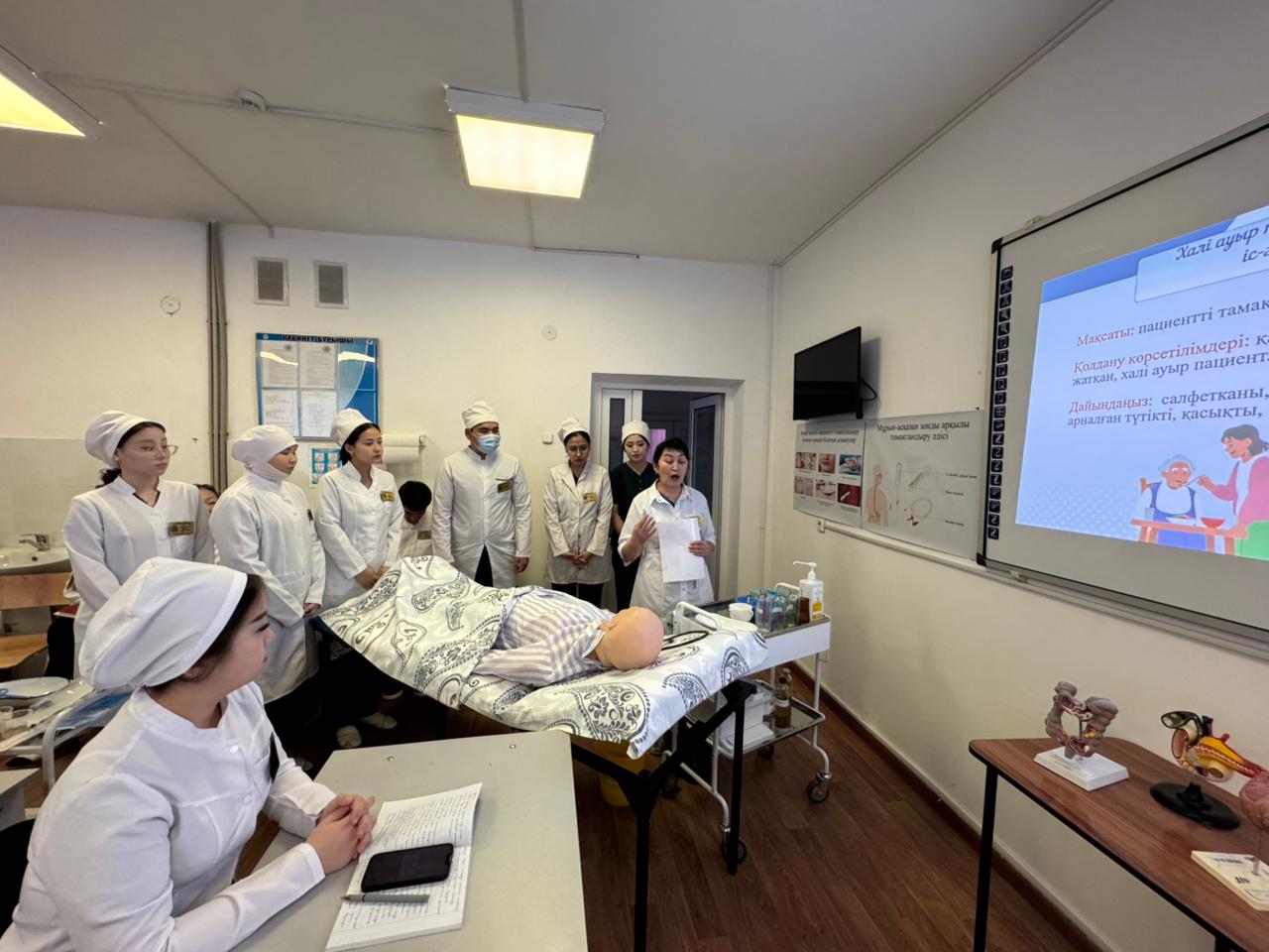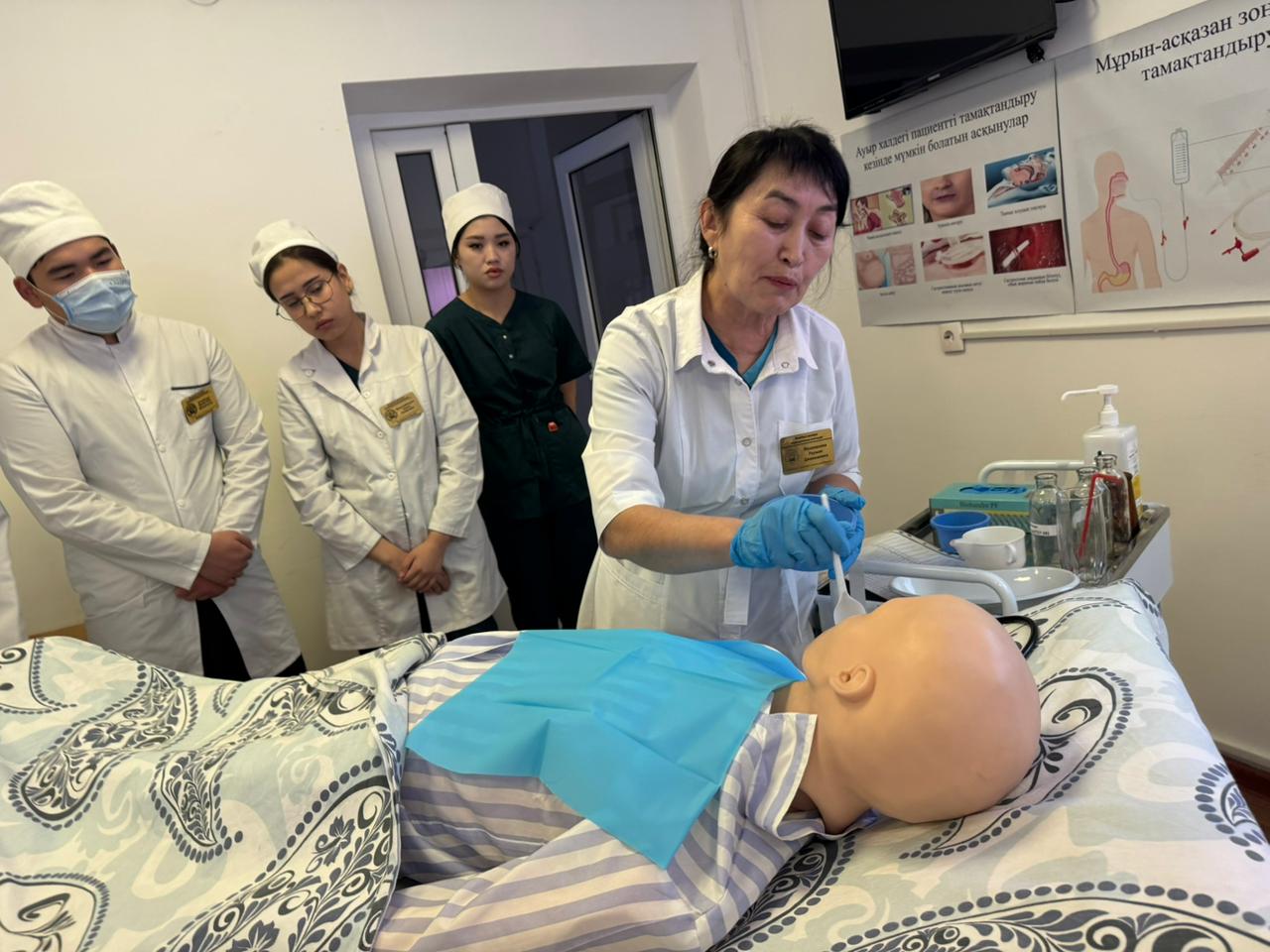 «Медициналық мекемелерде емдік тамақтануды ұйымдастыру. Пациентті тамақтандыру әдістері» тақырыбында ашық симуляциялық сабақ өткізді. Симуляциялық сабақтың мақсаты: студенттерге диета және диетотерапия ұғымдарын, диеталық тағамның құрамын, медициналық мекемелерде емдік тамақтандыруды ұйымдастыру қағидаларын, пациентті тамақтандыру түрлерін түсіндіру. Сабақ барысында халі ауыр пациенттерді табиғи және жасанды жолдармен тамақтандыру әдістері, тамақтандырудың көрсеткіштері мен қарсы көрсеткіштері, сондай-ақ мүмкін болатын асқынулардың алдын алу шаралары қарастырылып, іс-әрекет алгоритмдері көрсетіліп, студенттер тәжірибелік дағдыларды меңгерді.