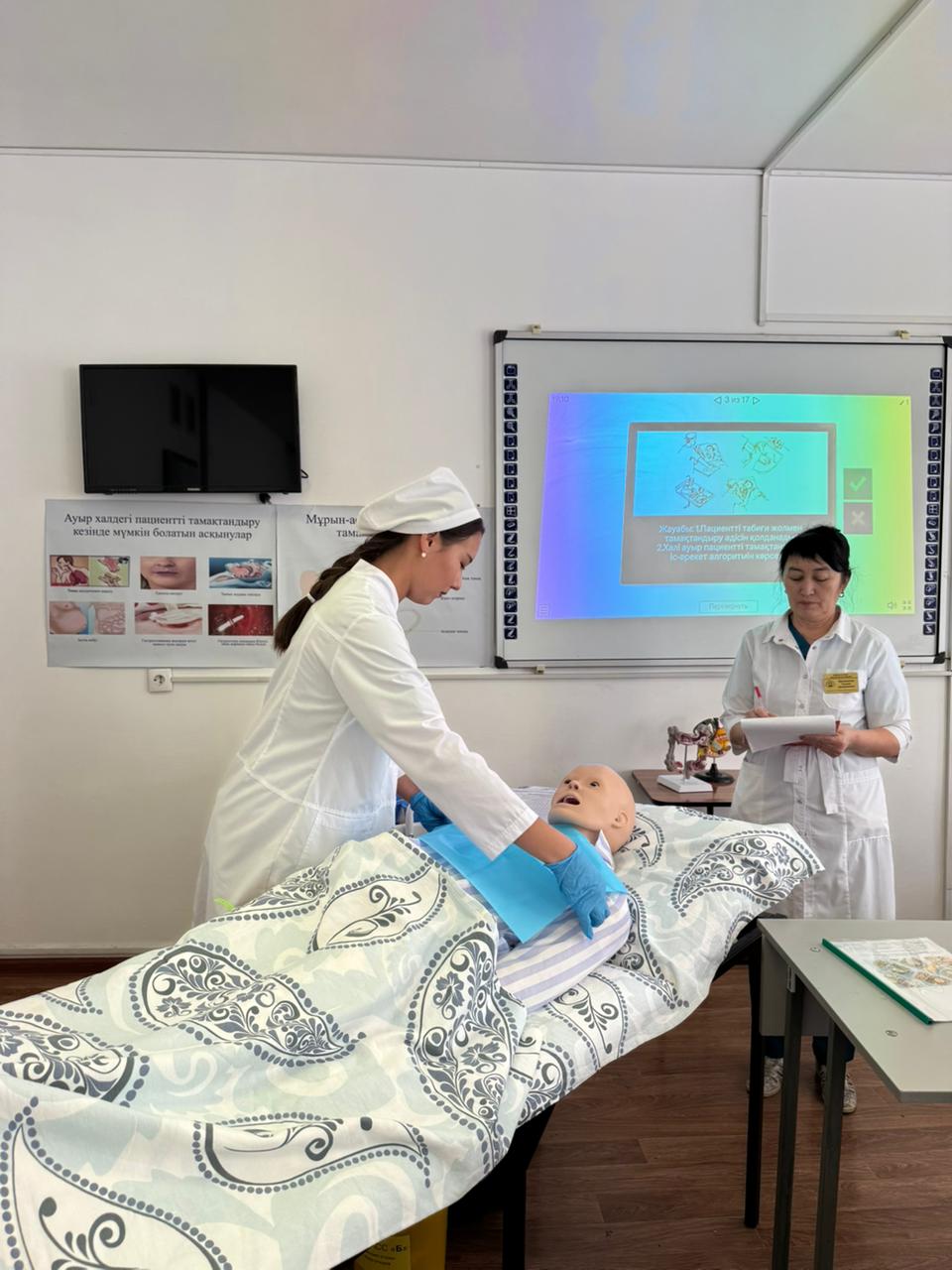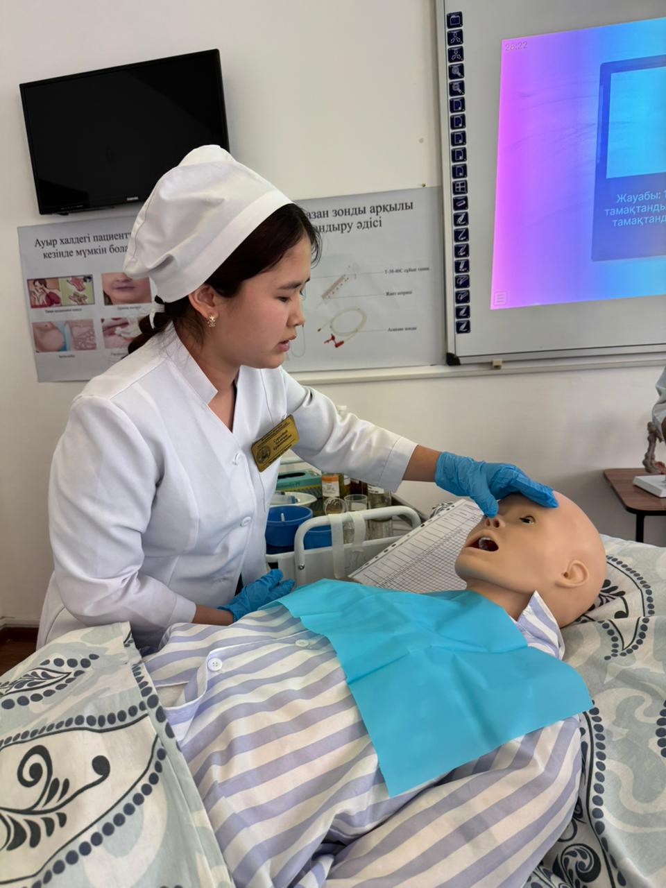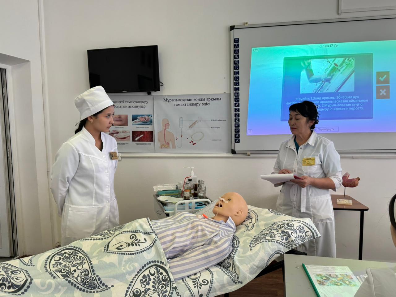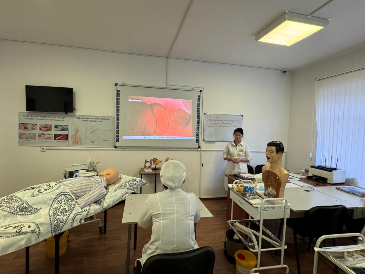 «Медициналық мекемелерде емдік тамақтануды ұйымдастыру. Пациентті тамақтандыру әдістері» тақырыбында ашық симуляциялық сабақ өткізді. Симуляциялық сабақтың мақсаты: студенттерге диета және диетотерапия ұғымдарын, диеталық тағамның құрамын, медициналық мекемелерде емдік тамақтандыруды ұйымдастыру қағидаларын, пациентті тамақтандыру түрлерін түсіндіру. Сабақ барысында халі ауыр пациенттерді табиғи және жасанды жолдармен тамақтандыру әдістері, тамақтандырудың көрсеткіштері мен қарсы көрсеткіштері, сондай-ақ мүмкін болатын асқынулардың алдын алу шаралары қарастырылып, іс-әрекет алгоритмдері көрсетіліп, студенттер тәжірибелік дағдыларды меңгерді.