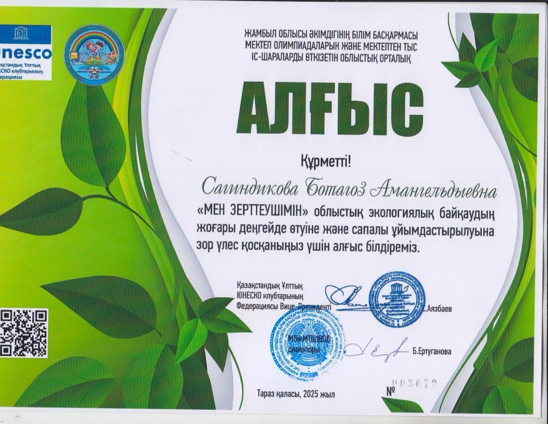 “Мен зерттеушімін” облыстық экологиялық байқауында сарапшы ретінде қатысқан колледж оқытушысы Сагиндыкова Б.А. Алғыс хатпен марапатталды.