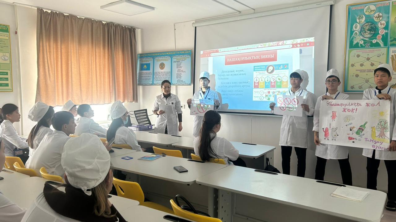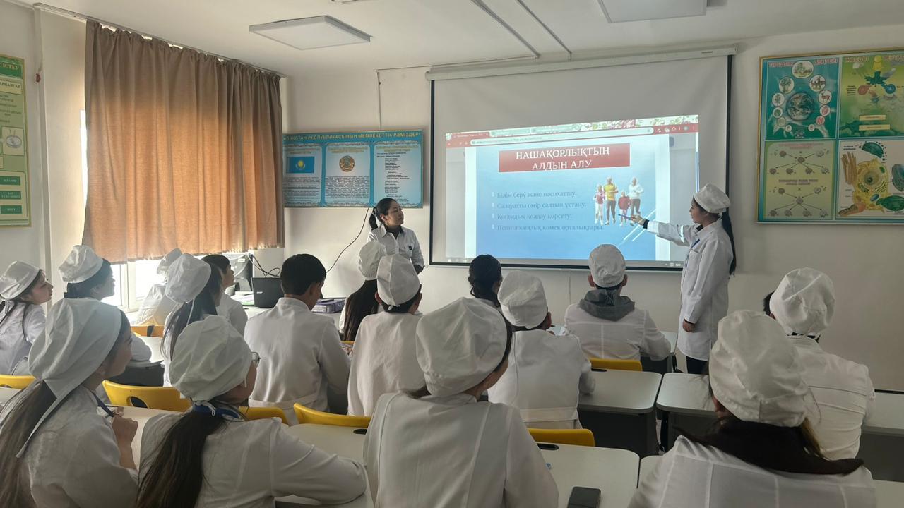 11.02.2026 ж. Жамбыл жоғары медициналық колледжінде салауатты өмір салтын қалыптастыру және нашақорлықтың алдын алу мақсатында наркобекет жетекшісі, топ кураторы А.Т. Кобегенованың ұйымдастыруымен, 114ЕФ-9/25, 113ЕФ-9/25 топ студенттерімен «Нашақорлық – індет, алдын алу – міндет» тақырыбында кураторлық сағат өткізілді. Куратор сағатында нашақорлыққа, темекіге және құмар ойындарға тәуелділіктің зардабы кеңінен түсіндіріліп, елімізде синтетикалық есірткіні өндіру, сақтау және таратуға қылмыстық жауапкершілік қарастырылғандығы жөнінде ақпарат берілді.