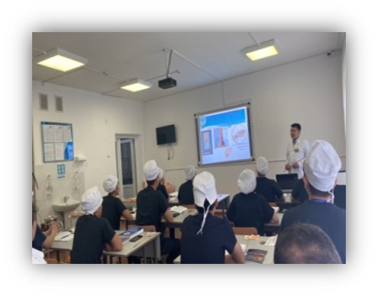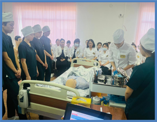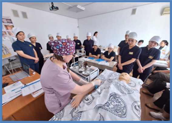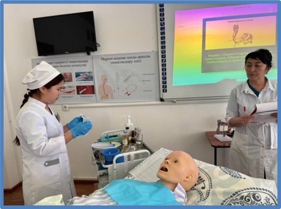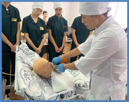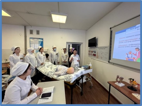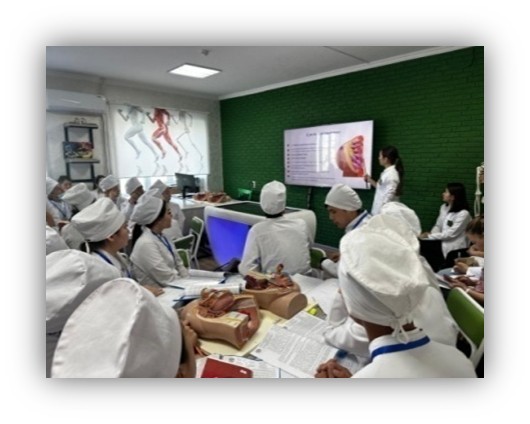 «Медициналық мекемелерде емдік тамақтануды ұйымдастыру. Пациентті тамақтандыру әдістері» тақырыбында ашық симуляциялық сабақ өткізді. Симуляциялық сабақтың мақсаты: студенттерге диета және диетотерапия ұғымдарын, диеталық тағамның құрамын, медициналық мекемелерде емдік тамақтандыруды ұйымдастыру қағидаларын, пациентті тамақтандыру түрлерін түсіндіру. Сабақ барысында халі ауыр пациенттерді табиғи және жасанды жолдармен тамақтандыру әдістері, тамақтандырудың көрсеткіштері мен қарсы көрсеткіштері, сондай-ақ мүмкін болатын асқынулардың алдын алу шаралары қарастырылып, іс-әрекет алгоритмдері көрсетіліп, студенттер тәжірибелік дағдыларды меңгерді.