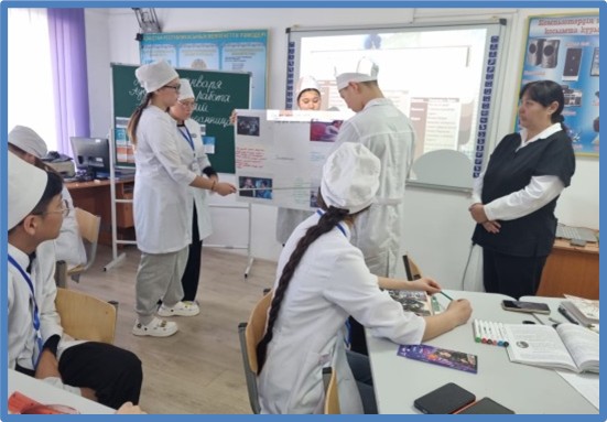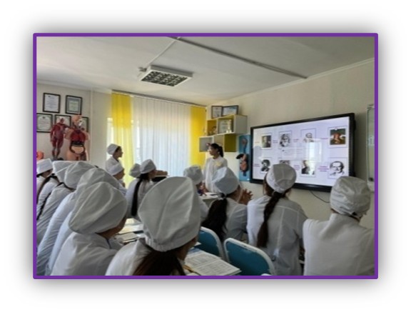 11.11.2024 ж. Жамбыл жоғары медициналық колледжінде Бекмурзаева Динара Турсунбаевна “Емдеу ісі” 114 ЕФ-9/24 топ студенттерімен “Биология” пәнінен , “Жасуша органоидтарының құрылысы мен қызметтерінің ерекшеліктері” тақырыбы бойынша ашық сабақ өткізді. Мақсаты: микроскоп арқылы көрінетін жасуша органоидтарының құрылысы мен қызметтерінің ерекшеліктерін түсіндіру арқылы студенттерге толық ақпарат берді. Студенттердің топтық, жеке және жұптық жұмыстары арқылы танымдық, білімдік деңгейін көтеру, ой белсенділігін дамыту, ұжымдаса отырып мәселелерді бірлесе шешуге, ойын түйіндеуге, шығармашылық ізденіске бағыттау, сөздік қорын, ауызша сөйлеу мәдениетін дамыту, медицинамен байланыстыра отырып, пәнге және өз мамандығына деген қызығушылықтарын арттыру.