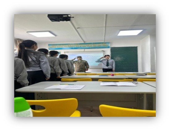 22.05.2024 ж. Жамбыл жоғары медициналық колледжінде № 3 Жалпы білім беру және жалпы ізгілендіру пәндерінің окытушысы Тулесбаев Өскен Аманович 103М-9/23 тобымен АӘжТД пәнінен «Қазақстан Республикасы Қарулы Күштерінің, басқа да әскерлері мен әскери құрылымдарының жалпы әскери жарғылары» тақырыбына сынамалы ашық сабақ өткізілді.