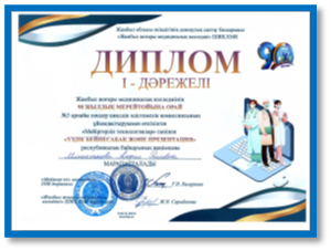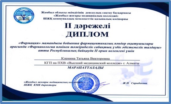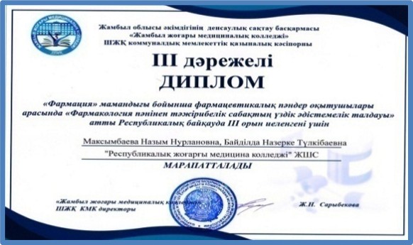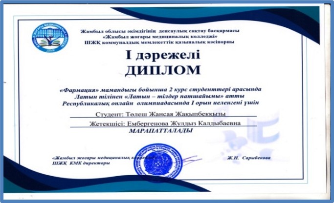 І орын – Абдыкадырова Луиза Гламжановна – Шымкент жоғары медициналық колледжі.