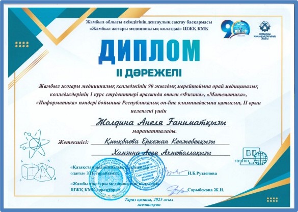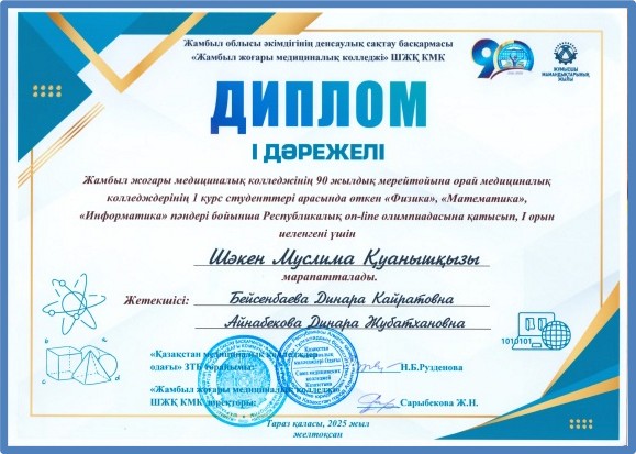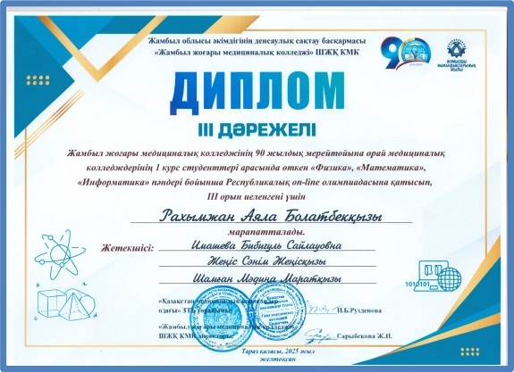 10.12.2025 ж Жамбыл жоғары медициналық колледжінің 90 жылдық мерейтойы аясында медициналық колледждерінің 1 курс студенттері арасында «Физика», «Математика», «Информатика» пәндері бойынша Республикалық on-line олимпиада өткізілді.