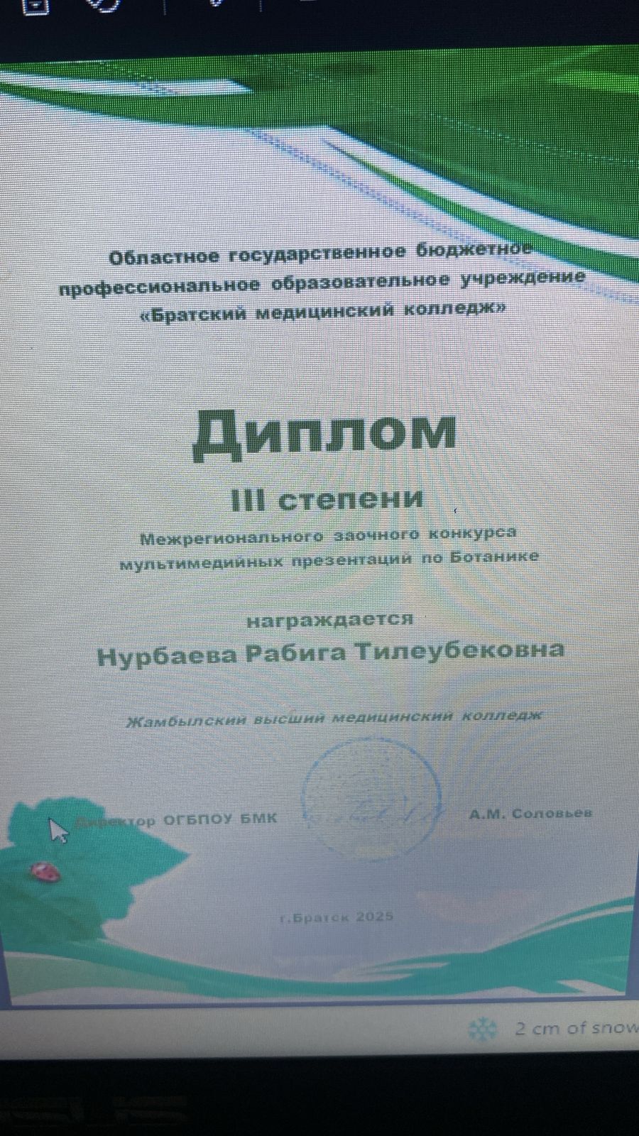 17 ноября 2025 года по инициативе Братского медицинского колледжа состоялся конкурс мультимедийных презентаций по дисциплине «Ботаника» для специальности «Фармация», цель которого — определение морфологии и состава лекарственных растений в межрегиональном формате. В конкурсе приняли участие преподаватели фармацевтических дисциплин Андакулова К.Т., Серкебаева А.К. и Нурбаева Р.Т., которые заняли призовое III место и были награждены дипломом III степени.