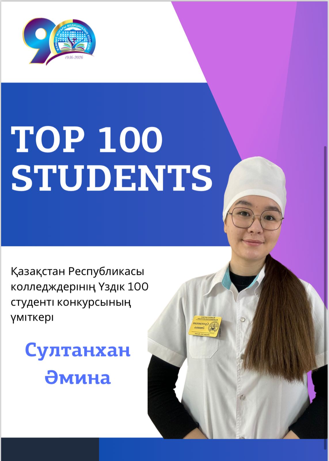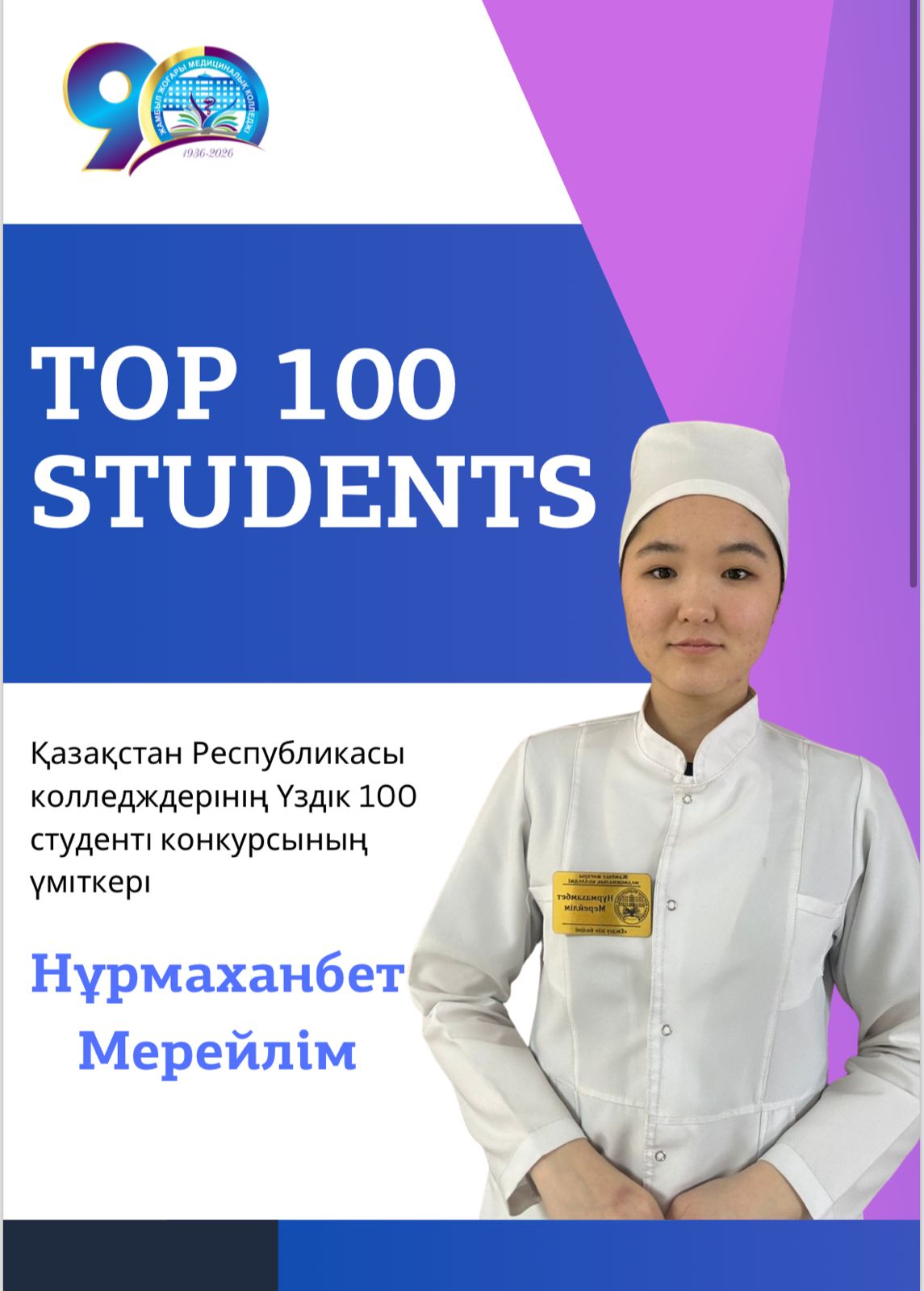«Үздік 100 студент» жобасы — еліміздің кәсіптік және техникалық білім беру жүйесіндегі ең дарынды, білімді және креативті жастарды анықтауға бағытталған конкурс. Қазақстан Республикасы колледждерінің «Үздік 100 студенті» байқауының үміткері – Нұрмаханбет Арайлым. 219ЕФ-9/24 тобының студенті. Колледждің қоғамдық өміріне белсене араласатын «Біріккен медицина жастары» ұйымының мүшесі, білім мен белсенділікті қатар алып жүрген оқу озаты, түрлі деңгейдегі іс-шаралардың бастамашысы және ұйымдастырушысы. Арайлымның алдағы сайыста жеңіске жетіп, колледжіміздің атын республикалық деңгейде асқақтатуына тілектеспіз! Жеңіс жолында сәттілік серік болсын!
