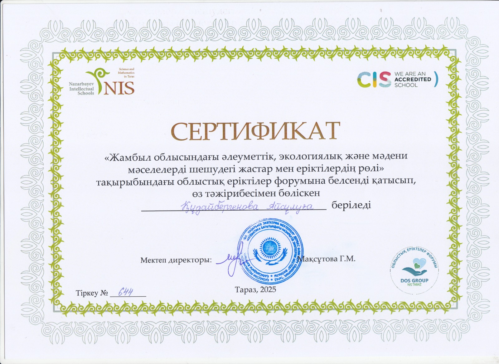 «Жамбыл облысында әлеуметтік, экологиялық және мәдени мәселелерді шешудегі жастар мен еріктілердің рөлі» тақырыбында өткен облыстық еріктілер форумына белсене қатысып, тәжірибелерімен бөліскен колледж студенттері сертификатқа ие болды. Жетекшісі Құдайбергенова А.К.