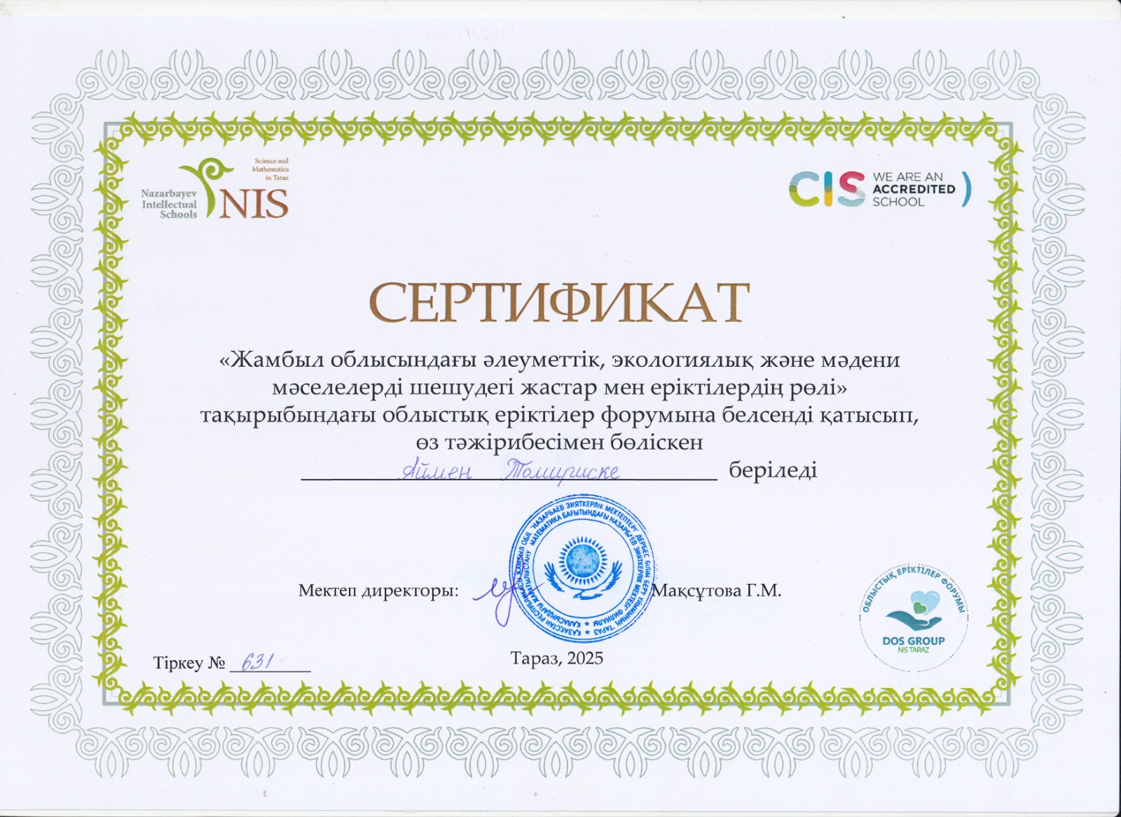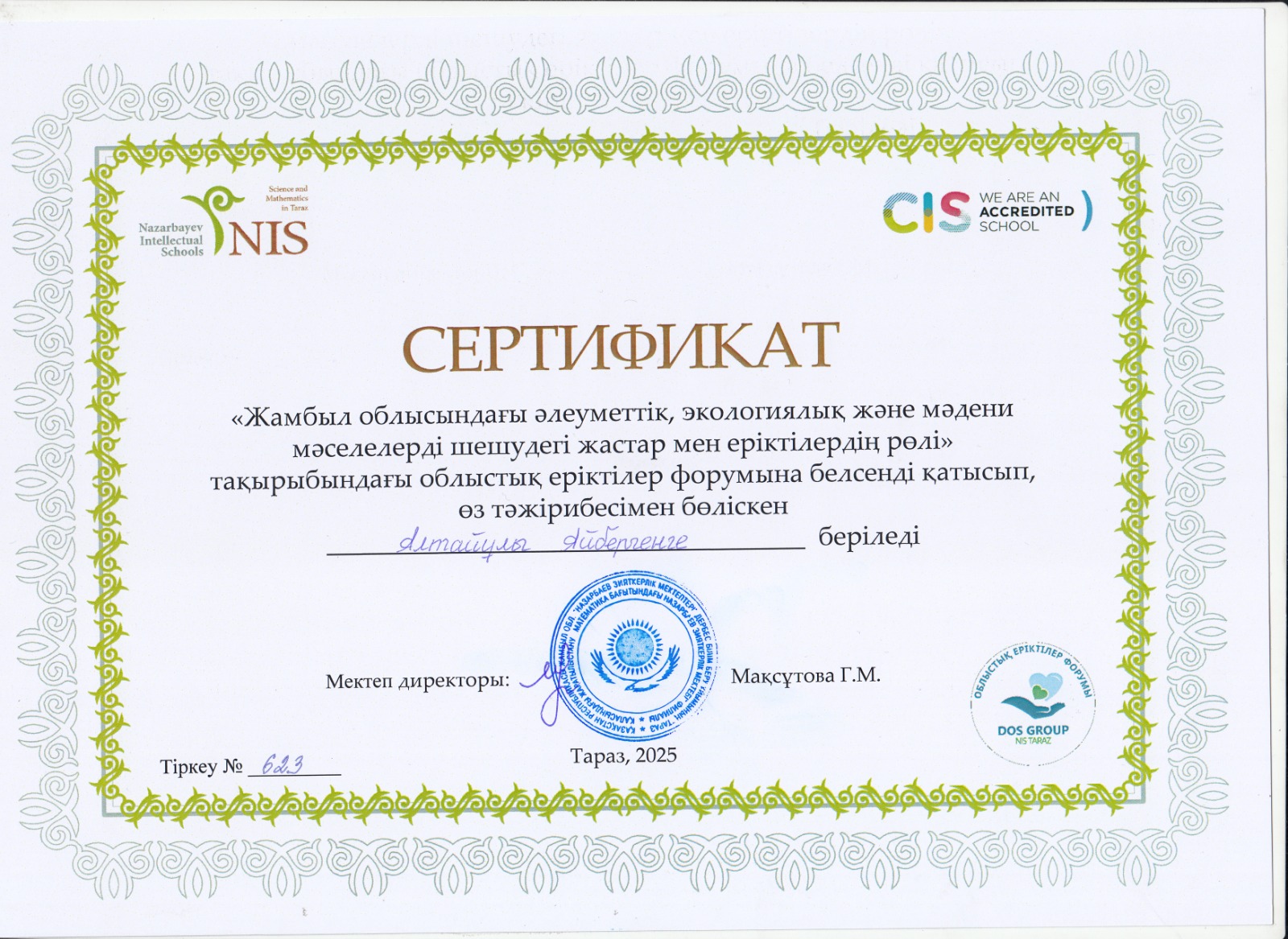 «Жамбыл облысында әлеуметтік, экологиялық және мәдени мәселелерді шешудегі жастар мен еріктілердің рөлі» тақырыбында өткен облыстық еріктілер форумына белсене қатысып, тәжірибелерімен бөліскен колледж студенттері сертификатқа ие болды. Жетекшісі Құдайбергенова А.К.