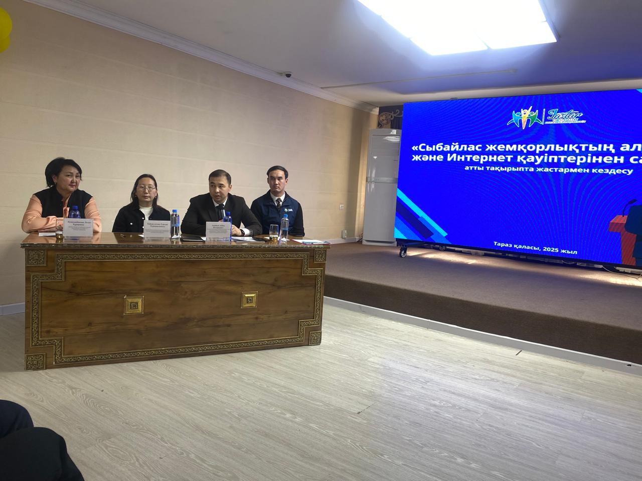11.12.2025 ж. Сыбайлас жемқорлықтың алдын алу бойынша «9 желтоқсан – Дүниежүзілік жемқорлықпен күрес» күніне орай «Жемқорлықпен күресу – басты міндетіміз» тақырыбында сыбайлас жемқорлыққа қарсы агенттігінің маманымен кездесу өткізілді. Кездесу қонақтары: Қазақстан Республикасы Мемлекеттік қызмет істері агенттігінің Жамбыл облысы бойынша департаментінің Сыбайлас жемқорлықтың алдын алу басқармасының бас маманы Ажибаев А.И., Жамбыл облысы әкімдігінің білім басқармасының Облыстық психологиялық қолдау орталығының әдістемелік бөлім басшысы Байдаулетова Т.Т. және «Жастар ресурстық орталығы» КММ маманы Амангелді Н.Н.