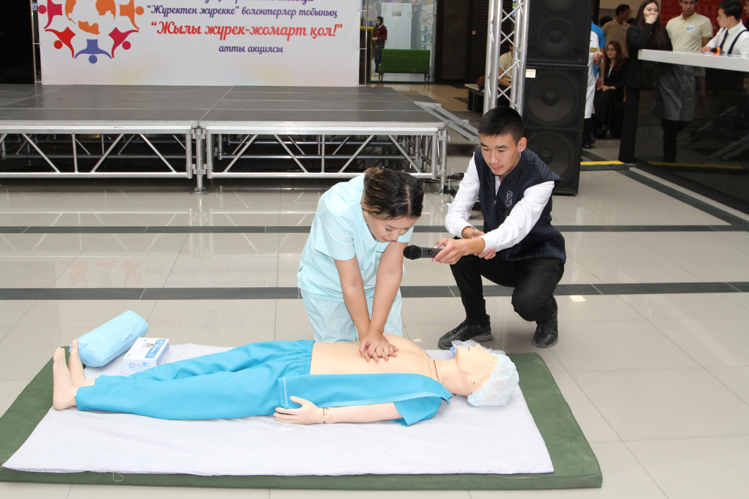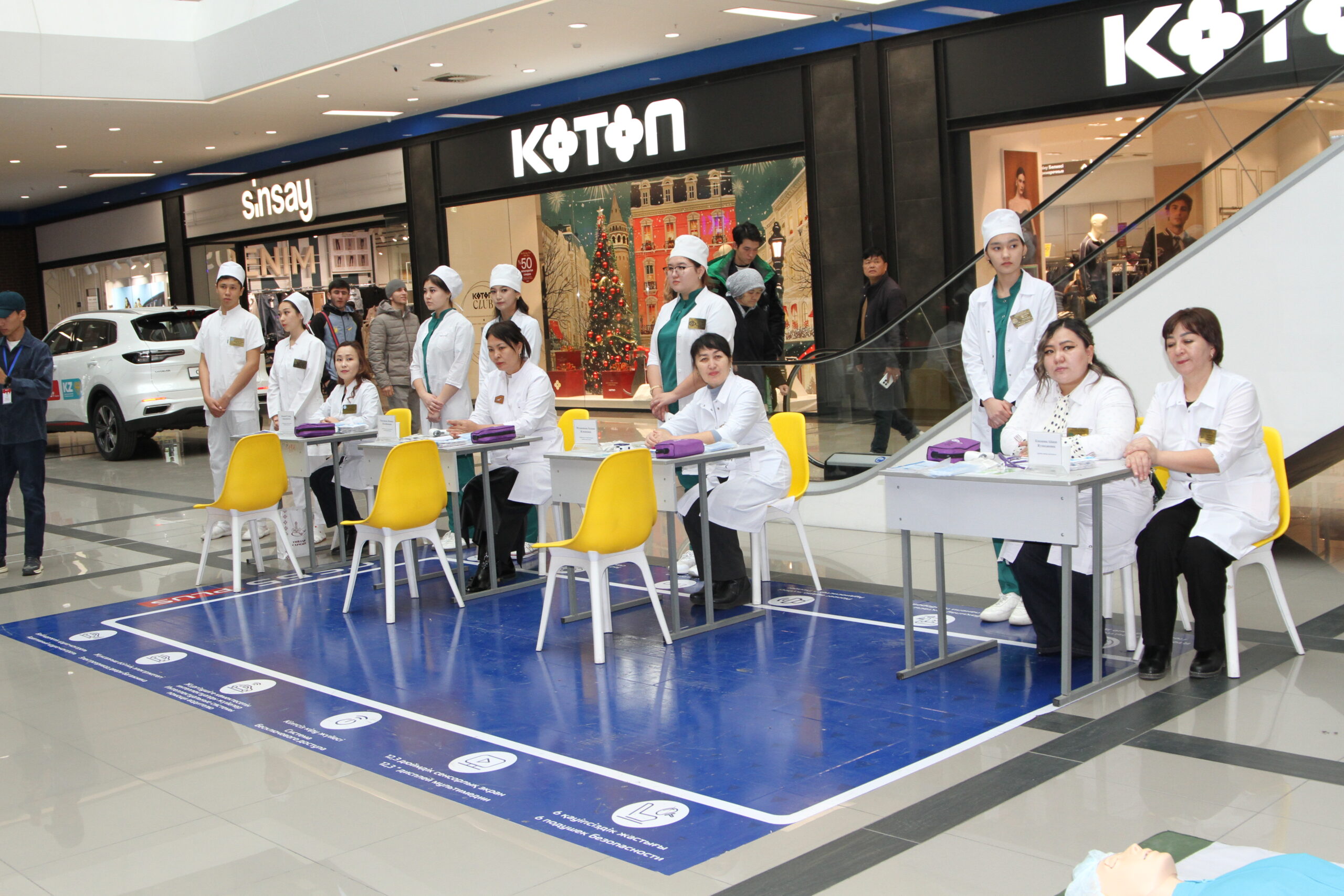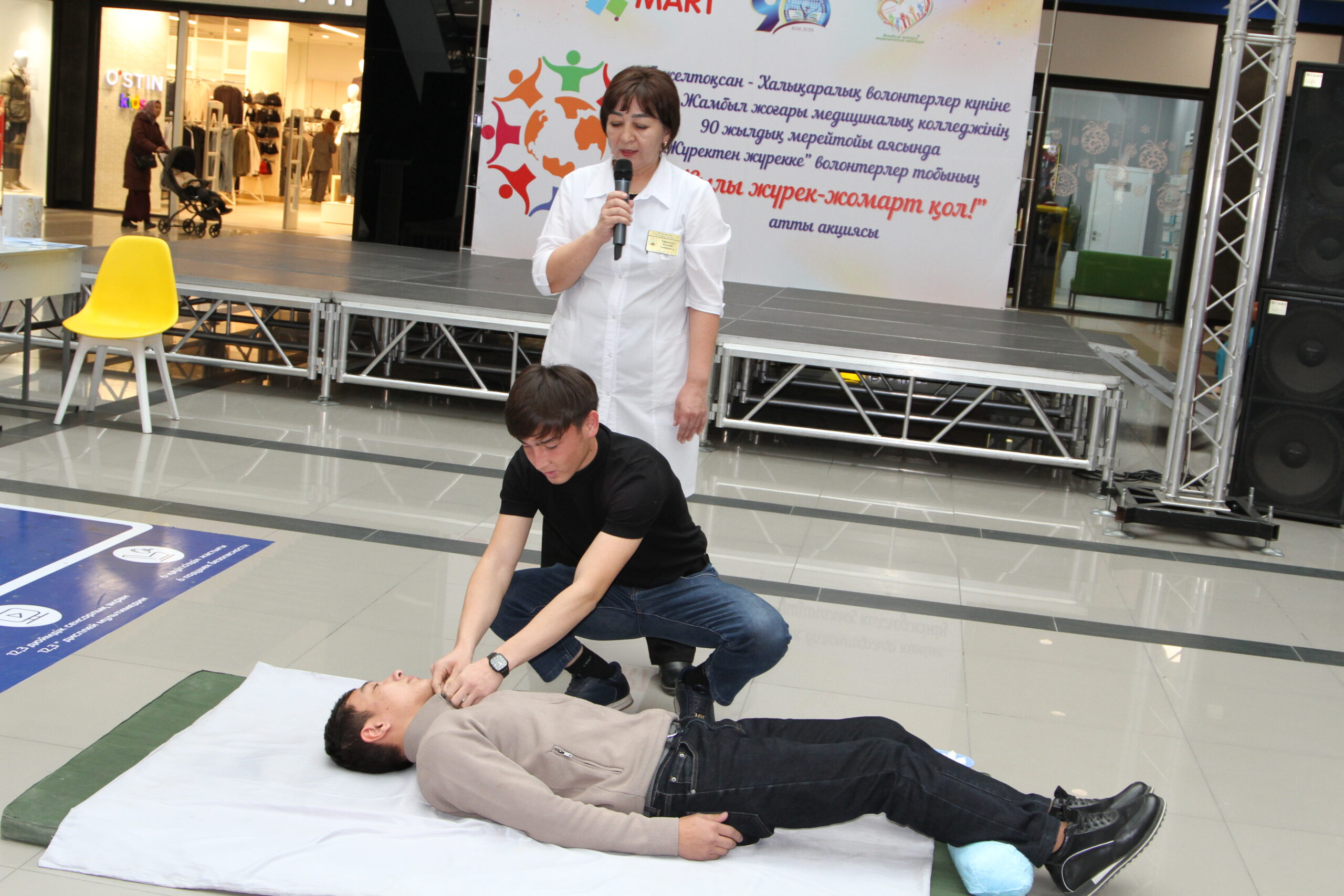 Студенттер ««MART» сауда орталығына келген қонақтарды көңілді флешмоб биімен қарсы алып, денсаулыққа арналған және психологиялық кеңестер жазылған жаднамаларды таратып, колледждің клиникалық дәрігер-оқытушыларынан кеңестер алуға жолдады. Акция мақсаты: қала тұрғындарына санитарлық-гигиеналық нормаларды сақтау, тұмау ауруының жедел респираторлық белгілері байқалған жағдайда дер кезінде медициналық комекке жүгіну, жеке қорғаныс шараларын қолдану және денсаулықты тұрақты бақылаудың маңыздылығы бойынша түсіндіру жұмыстары жүргізілді.